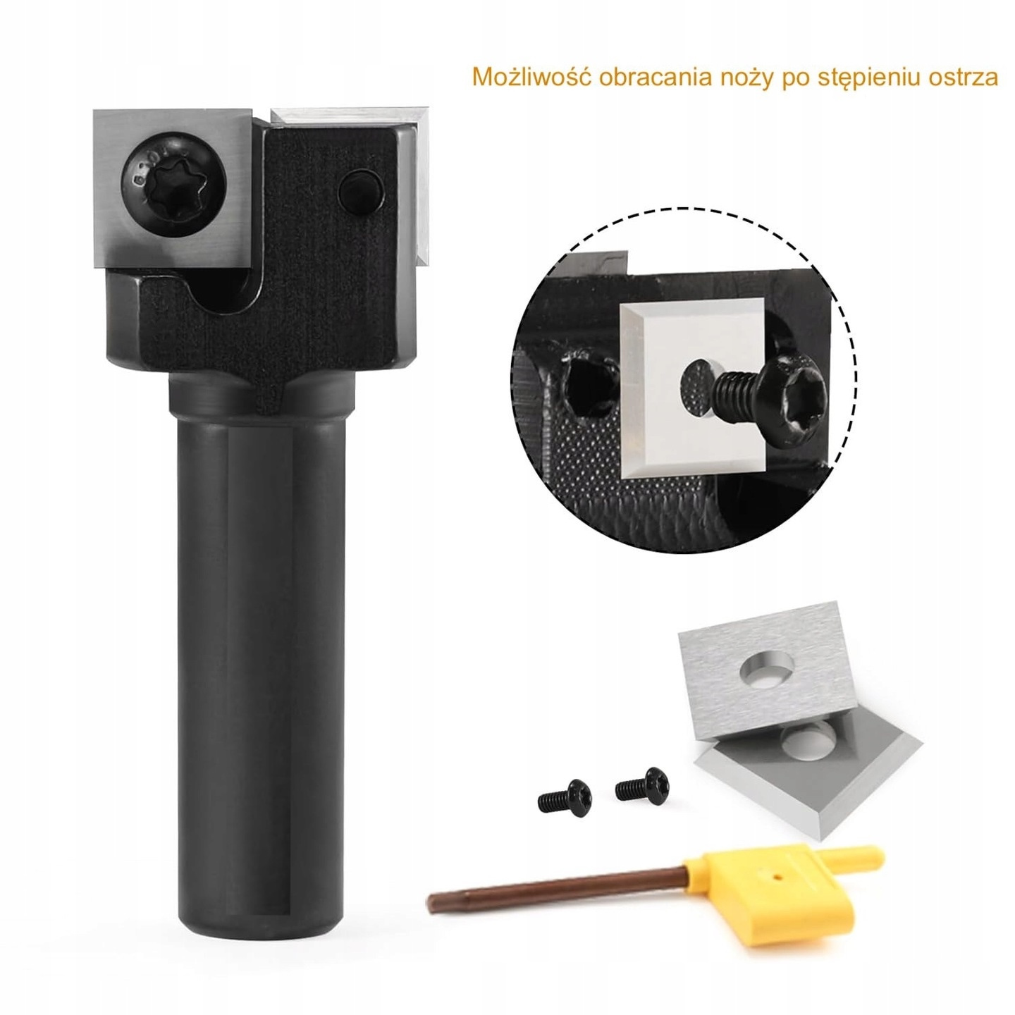 W zestawie frez z zamontowanymi dwoma płytkami, klucz do zamontowania płytek, plastykowe pudełko do przechowania.
